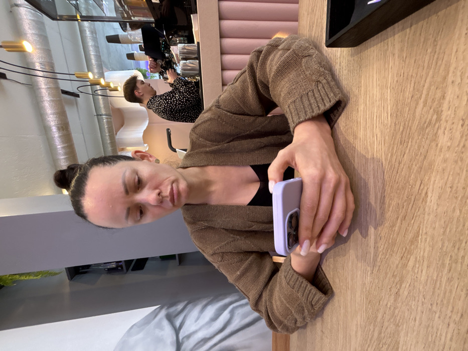 This image depicts an indoor scene within a cafe or coffee shop located in Zelenogradsk, Russia. In the foreground, a woman is seated at a light-colored wooden table. She wears a brown cable-knit cardigan over a black top, and her dark hair is styled in a top bun. She holds a light purple smartphone in both hands, actively viewing its screen with her gaze directed downwards. Her fingernails are painted with a light polish. A black rectangular tray or object is partially visible on the table to her right. In the mid-ground and background, the cafe interior is visible. To the right, behind a counter with a pink fluted facade, a male barista with short light-colored hair, wearing a dark polka-dotted shirt, operates an espresso machine. Various coffee-making implements, metal pitchers, and disposable cups are arranged on the counter. Overhead, multiple brass-toned pendant lights hang, and exposed silver-colored ventilation pipes are visible across the ceiling. To the left, a plain light-colored wall features an abstract white mural or relief, and a small section of green foliage is present at the upper left. The overall lighting suggests an indoor setting with both artificial and ambient light sources.