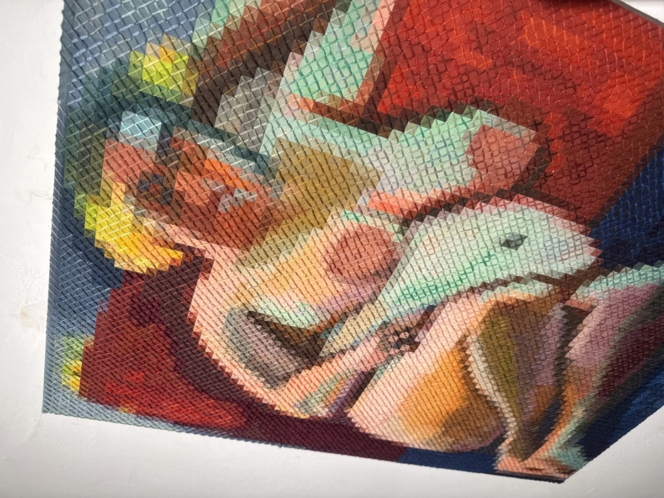 A captivating artwork displays a crouching figure in a mosaic-like style. The figure, with pale skin tones, is rendered in shades of white, light blue, and orange, contrasting with a vibrant red garment. The background is a mix of blue and dark red, creating depth. The unusual texture, resembling a grid or small pyramids, adds an intriguing dimension, giving the piece a tactile quality. The artwork's perspective is low, enhancing its unique presentation.