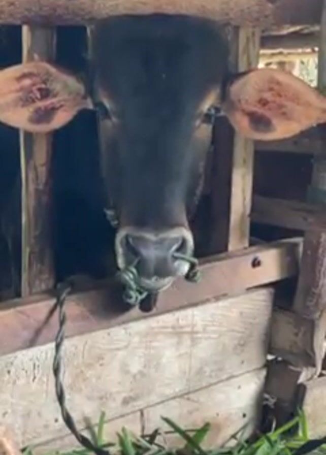 A cow is eating in a wooden enclosure. The cow is dark brown or black and has a green rope tied to its nose. The enclosure is made of rough wood and rope. Another cow, lighter in color, is seen in a nearby pen. The scene appears to be in a rustic farm or agricultural setting.