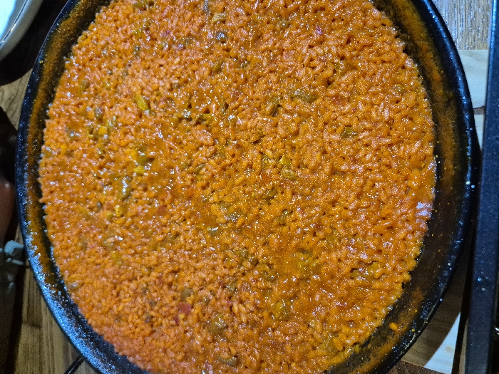 - "A circular, dark-colored pan, characteristic of a paella pan, is centrally positioned and filled with an orange-red rice dish, likely located in Piedrahíta, Spain" by FM-7iI1o2, licensed under CC BY 4.0