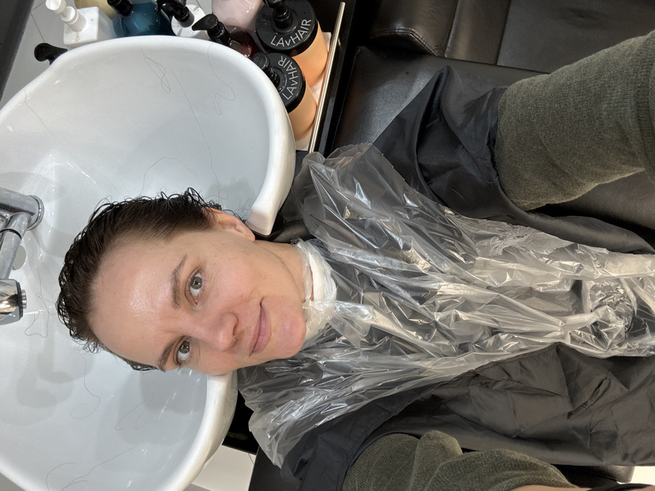 A female individual is depicted in a close-up, high-angle selfie within a hair salon in Rafailovići, Montenegro