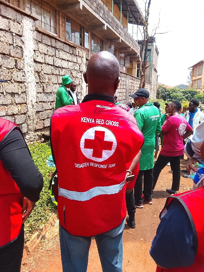 The image depicts an outdoor daytime scene in Kiambu Township ward, Kenya. In the immediate foreground, an adult male is shown from behind, bald, wearing a red Kenya Red Cross Disaster Response Team vest. The vest displays "KENYA RED CROSS," the Red Cross emblem, and "DISASTER RESPONSE TEAM" in white lettering, along with a horizontal reflective strip and a zippered pocket. This individual wears blue jeans. To the left, part of another person wearing a similar red vest is visible. In the midground, a group of approximately eight individuals stands on reddish-brown dirt ground. Notable figures include a male wearing a green bucket hat, a male in a green long-sleeved shirt with "Environment Affairs" partially visible on his back, a black cap, and sunglasses, and another male in a maroon t-shirt with a white circular logo. Other individuals are present, some in green attire and one in a white garment resembling a lab coat. They appear to be engaged in conversation or an organized assembly. The background features a multi-story building constructed from light-colored, rough-hewn stone blocks, with multiple rectangular windows featuring dark frames and a concrete ledge or balcony along the upper floor. Sparse vegetation, including a thin tree with minimal foliage, is visible. Additional buildings are discernible in the distance. The sky is clear.