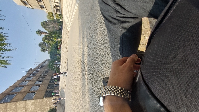 A person wearing a silver watch sits outdoors. In the background, a large, blocky building with many windows stands to the left. Pedestrians are visible in the distance. Above the building, trees line the area. The ground appears to be paved with light-colored stones or concrete. The focus is on the person's wrist and the watch, with the surrounding environment providing context.