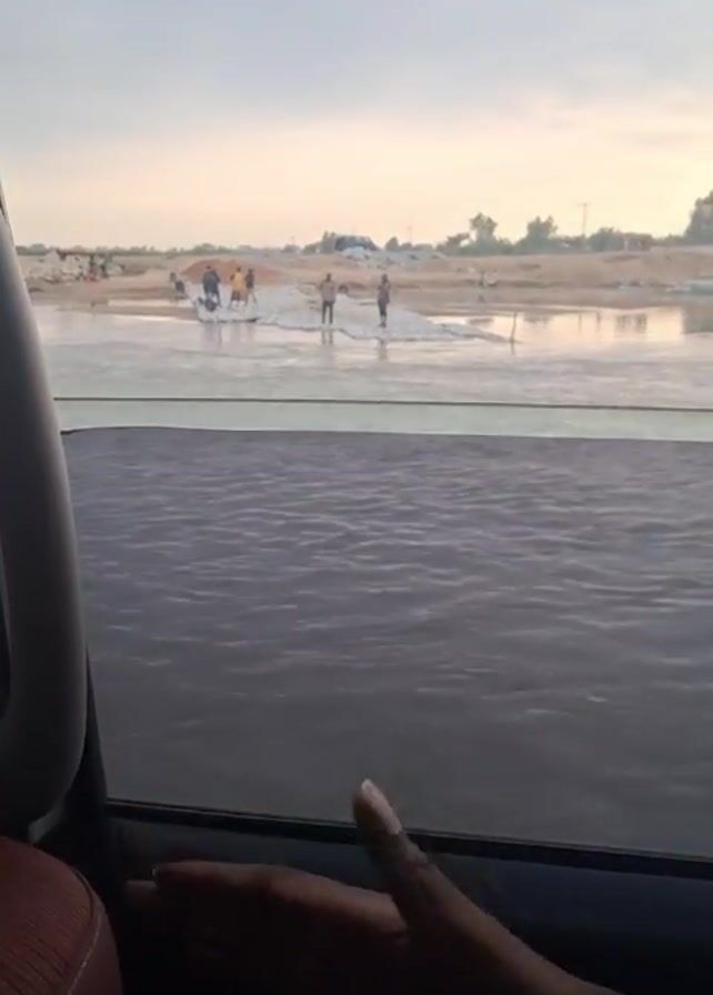 A person is recording from the inside of a vehicle as it is traveling on a road. Through the window, a scene of a body of water is visible, and a group of people are standing on what appears to be a sandbank or a land formation slightly above the water level. The group consists of about six individuals. Some are partially submerged in the water. The background beyond the people includes what seems to be piles of materials, possibly sand or construction related items, as well as some sparse vegetation. The overall atmosphere is one of a natural environment where people are engaged in some activity. The light suggests it could be either early morning or late afternoon.