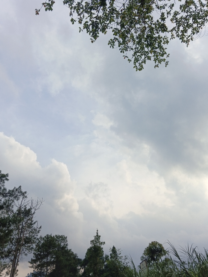 A vertical composition displays a partly cloudy sky framed by foliage. In the upper portion, tree branches with green leaves are spread across the top. The sky is filled with a mix of light and dark grey clouds, some appearing dense and others more translucent. Below, a line of green trees and tall grasses stretches across the lower edge, adding depth to the landscape. The overall tone is soft and natural, showcasing a moment of peaceful observation.