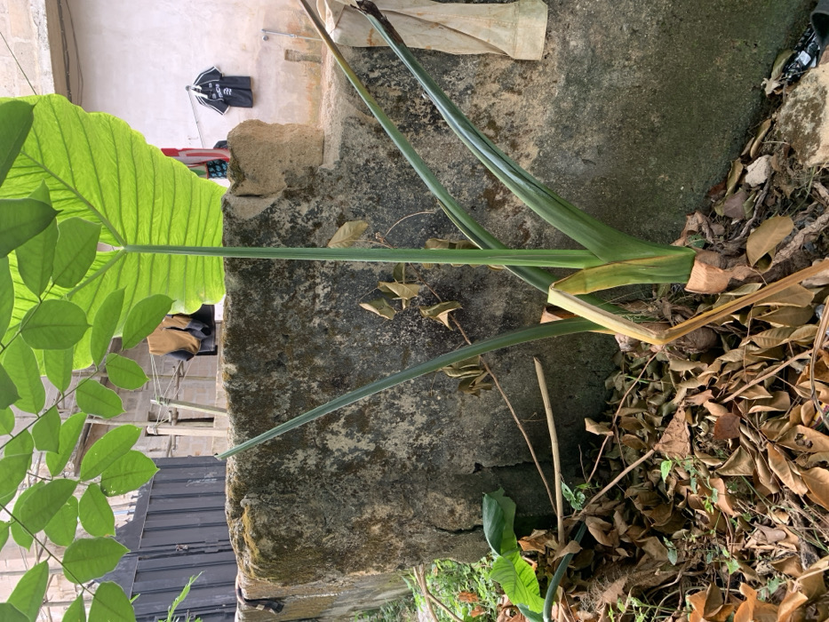 The image depicts an outdoor scene in Ikot Mbonde, Nigeria, characterized by vegetation and weathered structures. In the foreground, a large, broad-leafed plant with multiple green stalks rises from the ground, featuring a prominent, bright green leaf positioned at the upper center. The ground surrounding the plant is covered extensively with dry, fallen brown leaves and minimal green undergrowth. Directly behind the foreground vegetation, a horizontal concrete wall, discolored and partially covered with moss, extends across the mid-ground. To the left background, beyond the concrete wall, a dark metal gate is partially visible, with a light-colored building discernible behind it. To the right background, a light-colored building, possibly stucco or painted concrete, is present. Clothes are hanging on a clothesline in front of this building, including a brown shirt, a dark long-sleeved garment, and a black t-shirt with white graphics. A small stone or concrete pillar is also visible near the clothesline. No individuals are present in the scene. The environment is a semi-developed outdoor space indicating residential or backyard usage.