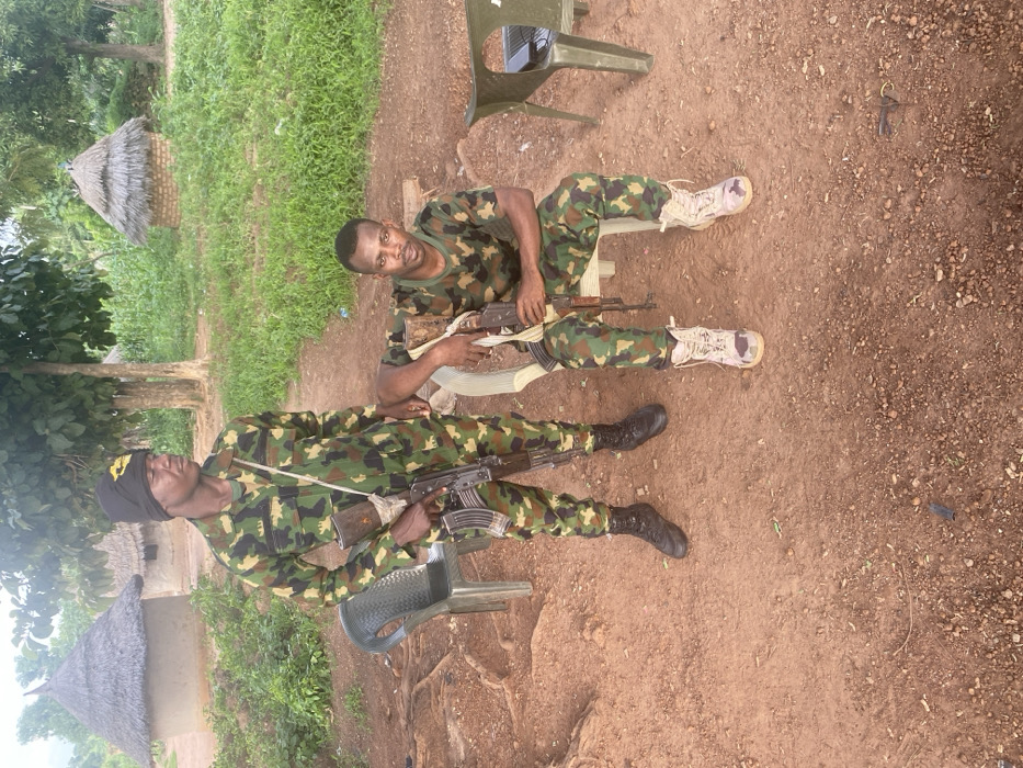 This outdoor scene, set in Wukari, Nigeria, features two adult males positioned on reddish-brown dirt ground. The individual on the left stands, oriented slightly to the right of the frame, wearing a black beanie and a long-sleeved military camouflage uniform. He holds an AK-pattern rifle vertically, with its buttstock resting on the ground. A black plastic chair is positioned behind him. The individual on the right is seated on a white plastic chair, facing the viewer, clad in a short-sleeved military camouflage top. He holds an AK-pattern rifle horizontally across his lap. His right arm rests on the backrest of his chair. To his immediate right, a green plastic chair supports a dark, rectangular object. The background consists of green vegetation, scattered trees, and two traditional circular huts with thatched roofs.