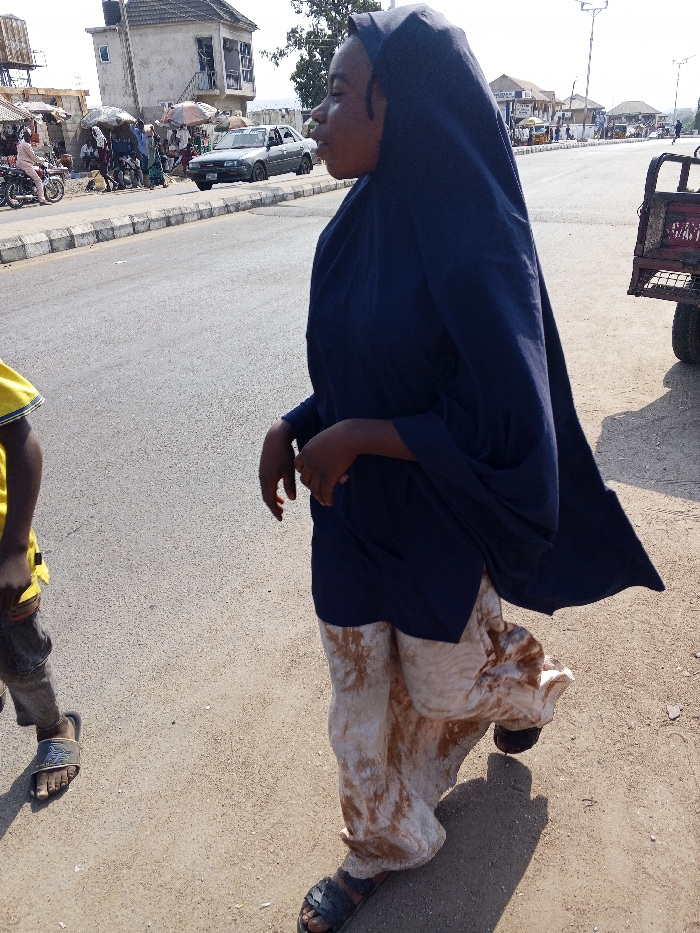 The image depicts a daytime street scene in Zango-ndaji, Nigeria. An adult female, characterized by dark skin, wears a navy blue hijab covering her head and upper body, along with light-colored, patterned wide-leg trousers and dark sandals. She is shown in profile, walking towards the right side of the frame, with her left hand partially visible. Adjacent to her on the far left, a child wearing a yellow shirt, dark pants, and dark sandals is partially visible, also in motion. Both individuals are positioned on a dusty asphalt road surface. In the mid-ground, a paved road is delineated by a concrete curb. To the left of the road, multiple individuals are visible, some congregated around market stalls with open umbrellas. A light-colored sedan drives on the road, while several motorcycles are present, including a prominent light-colored one parked on the far left. Buildings line the street, one notable multi-story structure featuring an octagonal upper section. Utility poles with overhead lines are also present. On the far right of the frame, a portion of a two-wheeled cart is visible near the roadside. The background reveals additional urban structures and streetlights extending into the distance under a clear sky.