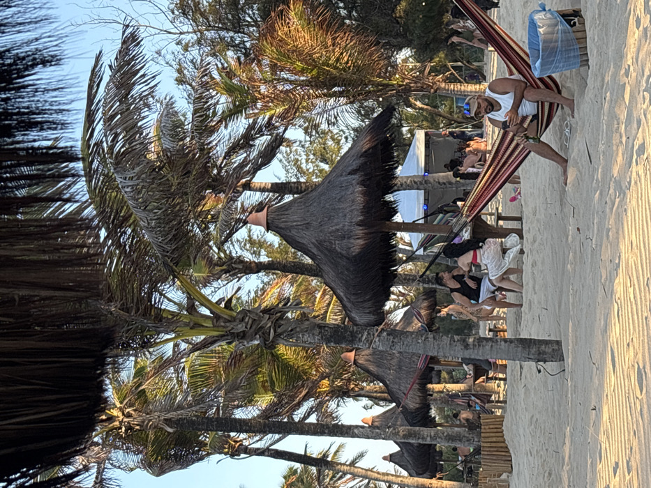 This image captures a sandy beach scene in Caucaia, Brazil, under a clear blue sky. Numerous palm trees with green and browning fronds dominate the upper and mid-ground. Several conical, thatched umbrellas, each topped with a terracotta-colored finial, are erected across the sand. Striped hammocks are strung between palm trunks or support poles. In the immediate foreground, a male subject, wearing a white tank top, camouflage shorts, a baseball cap, and sunglasses on his head, is seated in a red and white striped hammock, actively observing a smartphone held in both hands. A light blue plastic trash can with a liner is situated on the sand to his right. In the mid-ground, a couple, consisting of a man in a dark tank top and white shorts, and a woman in a red bikini top and white sarong, is seated at a wooden table under a thatched umbrella, engaged in conversation. Further back, a white canopy tent is visible, surrounded by other individuals standing and socializing. Approximately 15-20 people are present in the scene, dressed in casual beach attire, primarily engaged in leisure and social activities. Wooden fences and additional small tables are also visible.