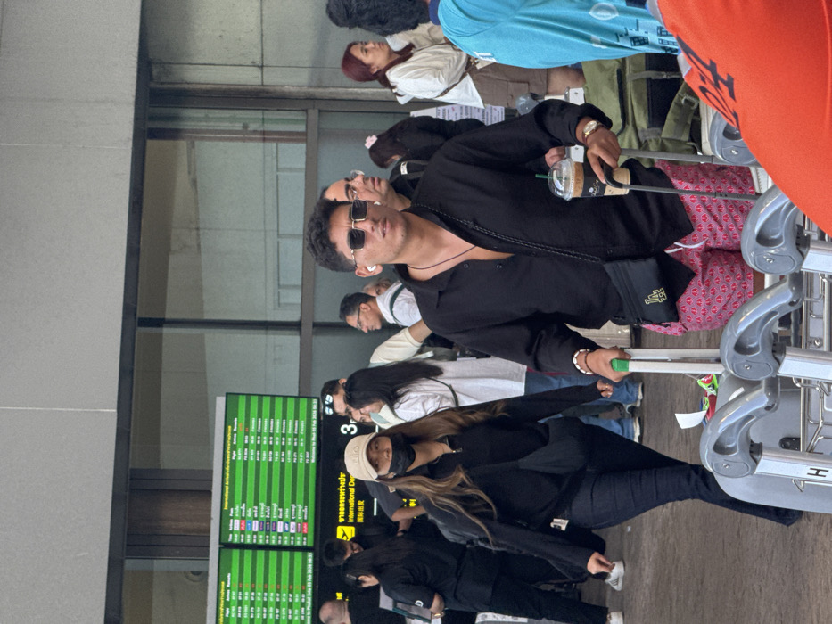 A group of people are standing in what appears to be an airport, waiting. One person is front and center wearing sunglasses, a black jacket, and patterned red and pink pants, holding a Starbucks drink and a luggage cart. Another person in a black outfit and beige baseball cap is slightly behind. An airport flight information display board can be seen on the left.