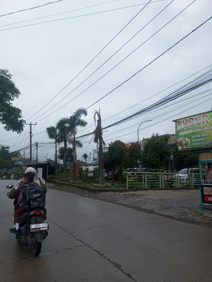 The image depicts an overcast daytime street scene in West Java, Indonesia, contrary to the user-provided location of Babaliya Mal., India. In the foreground, a dark-colored scooter, bearing license plate 'F 3051 FIS', travels away from the viewer on a concrete road. An adult, wearing a light-colored head covering, operates the scooter. A child passenger rides behind, wearing a patterned backpack and red pants. To the left, multiple utility poles support a dense network of overhead power lines. The roadside features a row of palm trees, one appearing damaged or dead, along with other green foliage. On the right, a prominent green banner advertises "BUBUR CIANJUR SPECIAL," listing menu items such as "SOTO MIE BOGOR," "SOTO DAGING," and "SOTO AYAM." A green metal fence is visible below this banner. The background reveals various buildings and additional trees under a uniformly gray, overcast sky, crisscrossed by numerous power lines.
