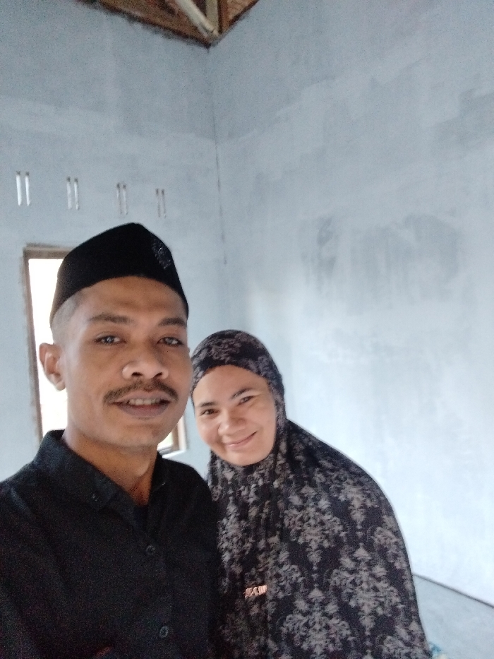 The image displays two individuals, a male and a female, captured in an indoor setting within Kutaglumpang, Indonesia. The male, positioned in the foreground-left, has a dark complexion, a mustache, and wears a black collared shirt and a black peci cap. He is smiling and looking directly at the camera. The female, positioned behind and to his right, has a lighter complexion, wears a dark hijab with a light pattern and a small brooch, and also smiles while looking directly at the camera. The background features unfinished light grey walls with visible texture. A rectangular window opening is visible behind the male's left shoulder, admitting natural light. The upper right corner of the scene reveals exposed wooden roof framing and ceiling elements, indicating an incomplete interior construction.