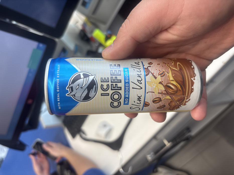 A human hand holds a slender aluminum can of "ICE COFFEE" prominently in the foreground