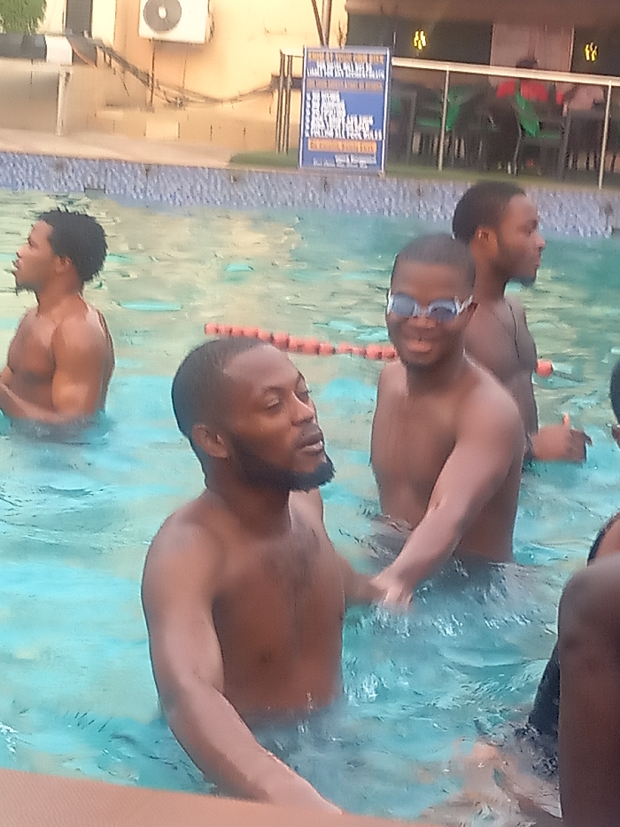 Four men are in a swimming pool