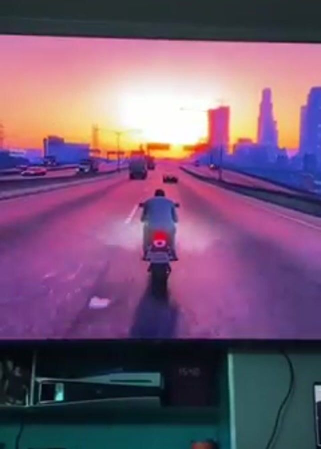 A video game is being played on a television. The game features a character riding a motorcycle on a highway as the sun sets over a city. The highway is populated with other vehicles. The game is vibrant with a purple and orange color scheme. Below the television is a shelf with a PlayStation 5 console, a clock, and a few other items.