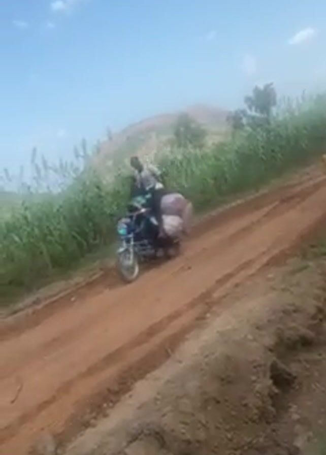 Two motorcycles, each carrying two people and large sacks, are traveling uphill on a dirt road. The road is flanked by tall green plants on one side. In the background, there's a large, rounded hill under a clear blue sky with a few clouds.