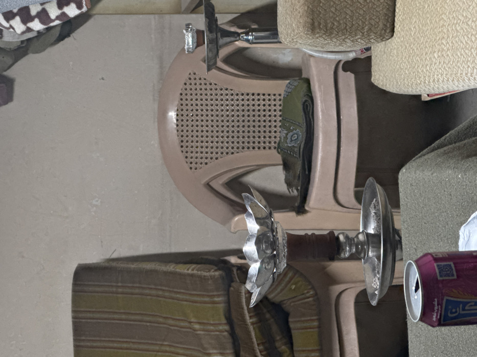 A tan plastic chair with a patterned seat has various items arranged on and around it. A patterned scarf is draped over the chair's back. A silver candle holder sits partially on the chair and a cushion, its ornate design featuring floral elements. A pink can with Arabic writing is positioned near the candle holder, partially obscuring a green cushioned object. A woven hat is placed on top of the chair.