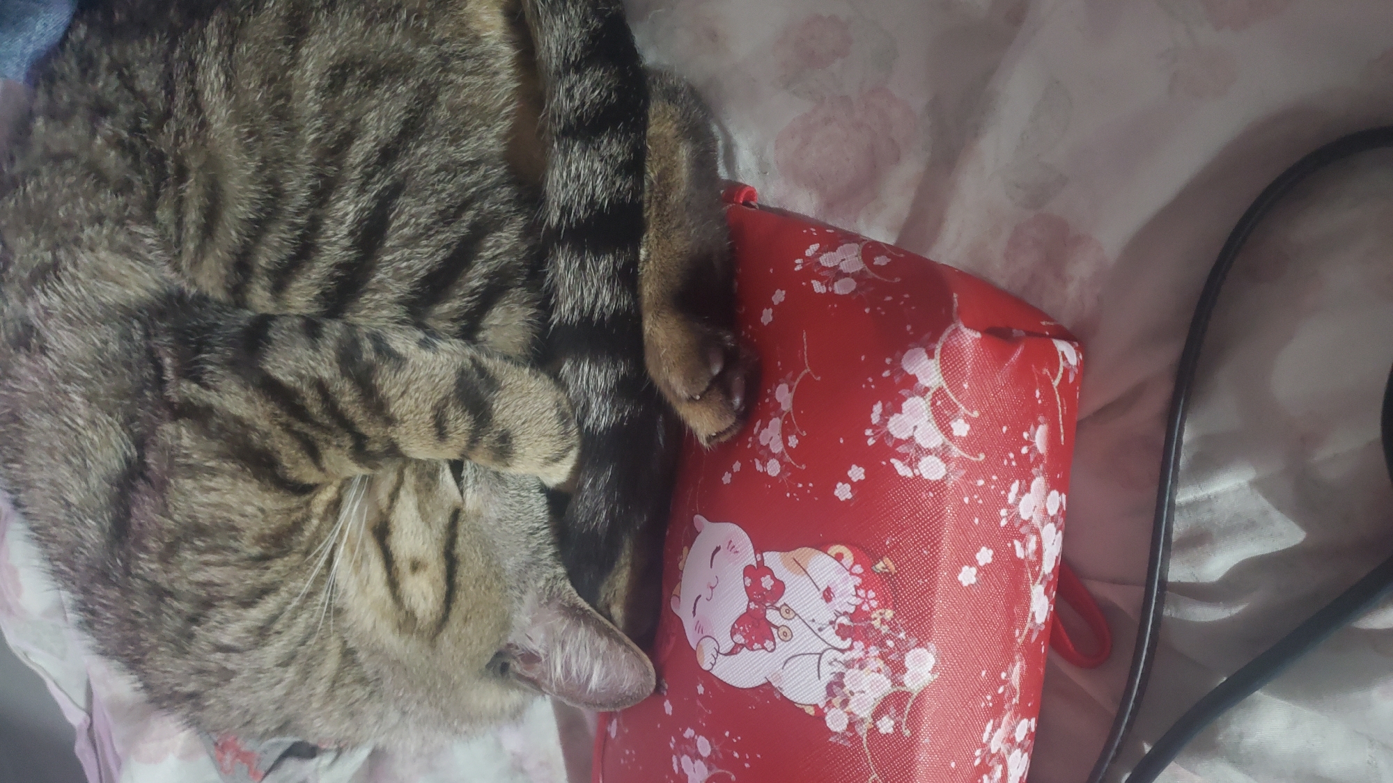 An indoor scene, presumably a bedroom, located in Curitiba, Brazil. A brown and black striped tabby cat is depicted sleeping, curled on a surface. Its right front paw covers its face, partially obscuring its features. The cat rests on a rectangular red pouch adorned with a white Maneki-neko illustration holding a golden coin, surrounded by white cherry blossom floral patterns. The pouch, in turn, rests on a light-colored, possibly off-white or light pink, bedsheet featuring faint, indistinct floral designs. A thin, black, curved strap is partially visible in the lower-left foreground.