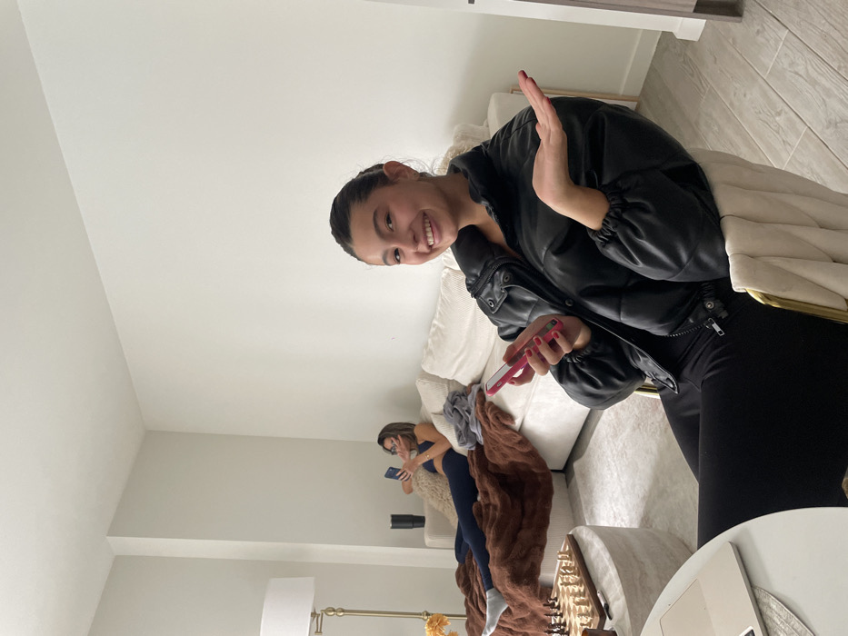 A woman wearing a black puffy jacket and leggings smiles and waves at the camera. She holds a pink phone in her left hand. Behind her is a beige couch with a cream-colored pillow and a white bag with gold handles. Another woman is on the couch looking at a phone, covered by a brown blanket. A floor lamp and a white table are in the foreground. The room has white walls and light-colored wood floors.
