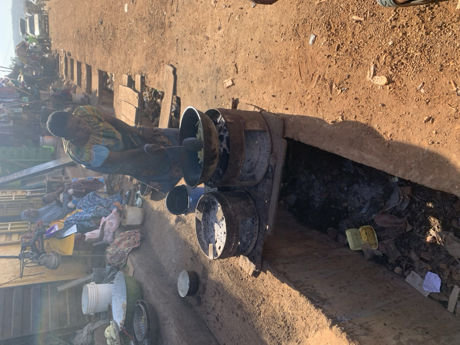 The image displays an outdoor scene in Rafin Par, Nigeria, set on a reddish-brown dirt ground with an open drainage trench running parallel to what appears to be a street. In the foreground, an adult female wearing a patterned dress actively stirs light-colored food within a dark wok, which rests on one of two improvised metal charcoal stoves. These stoves are positioned on wooden planks spanning the open trench, approximately 0.5 meters deep, containing ash, debris, and a yellow plastic container. To the left of the cooking area, various items including a white plastic bucket, a large green-rimmed metal basin, a smaller metal bowl, and a blue plastic bucket are on the ground. In the mid-ground, near a wooden structure, a woman in a light blue head covering sits holding a child, while another child and a person in a yellow garment are also visible. The background reveals a dirt road extending into the distance, lined with informal market stalls or structures, and several vehicles are parked or moving further down the road. The scene is illuminated by bright daylight.