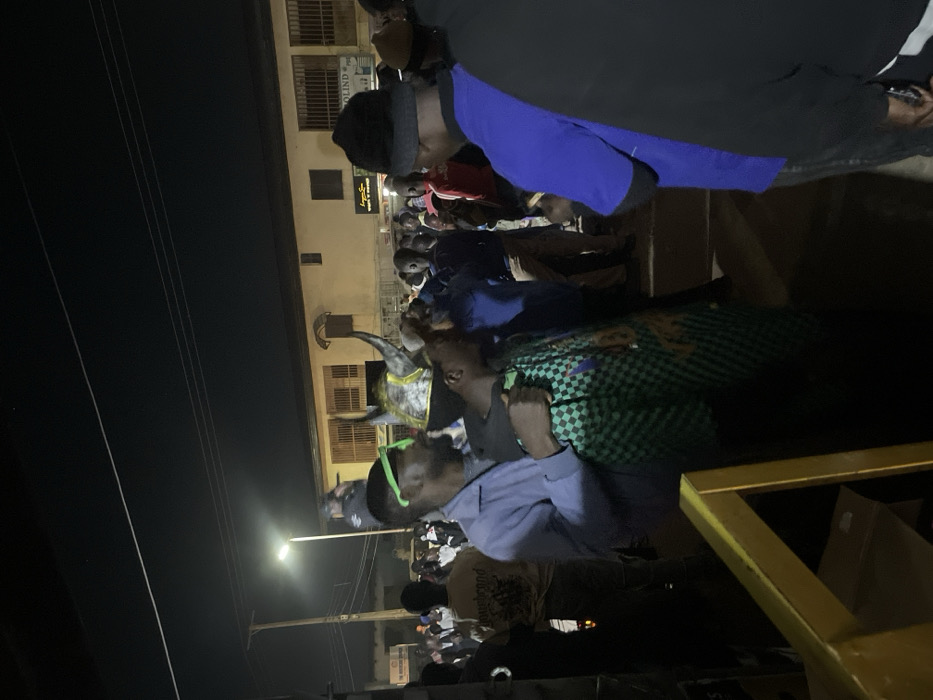 At night, a crowd gathers on a street, illuminated by a streetlight. A figure in a horned headdress stands out among the people, some of whom are wearing colorful clothing. A building with barred windows and a lit sign in a foreign language serves as a backdrop. Individuals in the foreground wear a black beanie, a blue jacket, and neon green glasses. The scene conveys a sense of urban nightlife and communal activity.