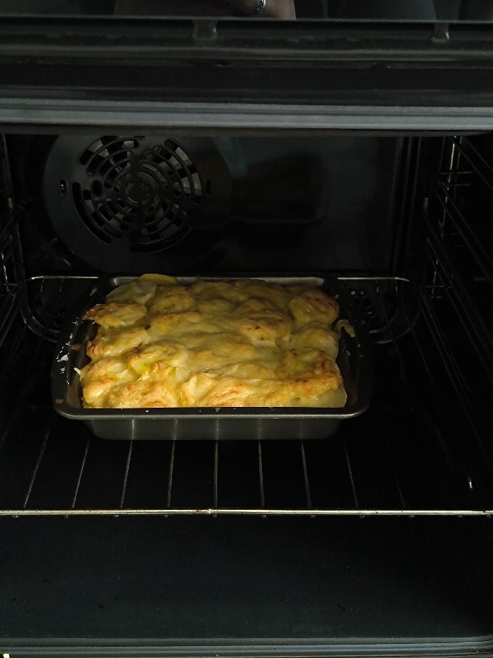 - "A rectangular baking dish containing a casserole-like food item with a golden-brown, bubbly, and slightly crusted surface is positioned on a middle metal rack inside a dark-colored electric oven" by FM-dWhzM2, licensed under CC BY 4.0