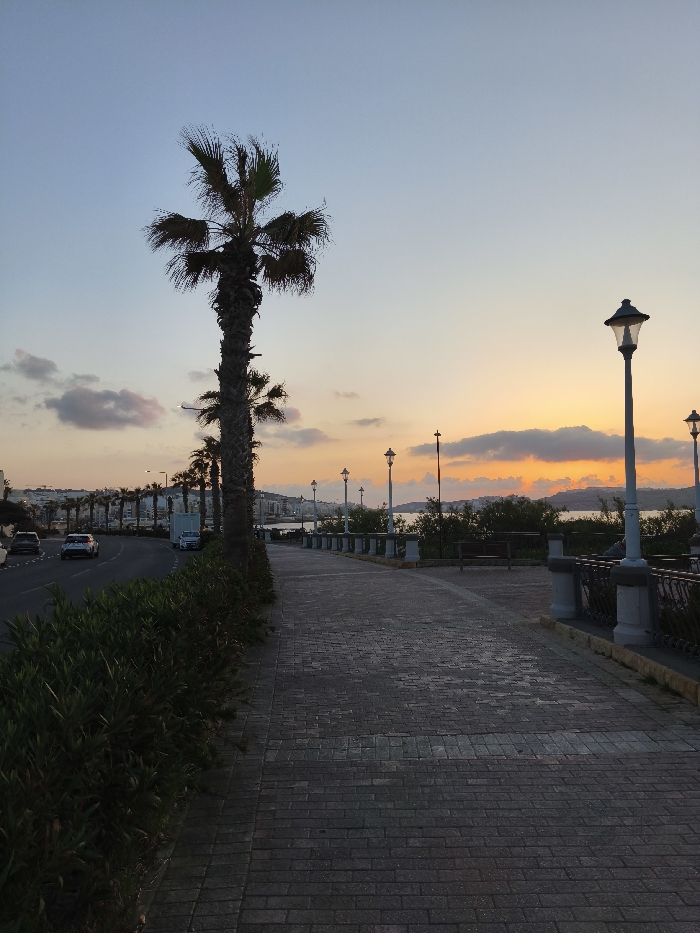 The image depicts a coastal urban environment within Saint Paul's Bay, Malta, at either dawn or dusk. The sky transitions from light blue at the top to orange and yellow hues near the horizon, with scattered, light-colored clouds present. In the foreground, a dense, dark green hedge borders the left side of a wide, paved pedestrian walkway constructed of rectangular grey paving stones. The walkway extends into the distance. Along the right side of the walkway, multiple traditional streetlights with light-colored posts and dark fixtures are uniformly spaced. A decorative metal railing, featuring dark metalwork and light-colored balusters, separates the promenade from a lower, vegetated area. In the midground, to the left of the walkway, an asphalt road with at least two visible lanes curves gently to the left and recedes. Two passenger cars, one light-colored and one dark-colored, are observed on the road, with a white utility truck parked further down. A prominent row of tall palm trees with dark, textured trunks and dark green fronds stands between the road and the pedestrian area, casting shadows. To the right of the walkway, the vegetated area slopes towards the water, containing shrubs and a dark wooden bench. Beyond this vegetation, the calm waters of the bay are visible, reflecting the sky's light. The background reveals the distant urban landscape of Saint Paul's Bay across the water, with numerous buildings and additional palm trees lining the far shore. No individuals are visible in the scene.