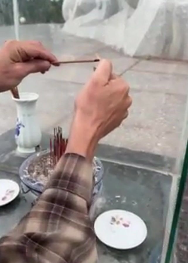 A person wearing a plaid shirt uses a lighter to light an incense stick. They hold the incense stick in their left hand and the lighter in their right. The incense stick ignites and a small flame appears at the tip. In the foreground is a glass-covered memorial or altar area. Within the enclosed space are several small white plates, a vase, and a pot filled with sand and more incense sticks. A large white statue can be seen through the glass enclosure. The surrounding environment is outdoors.
