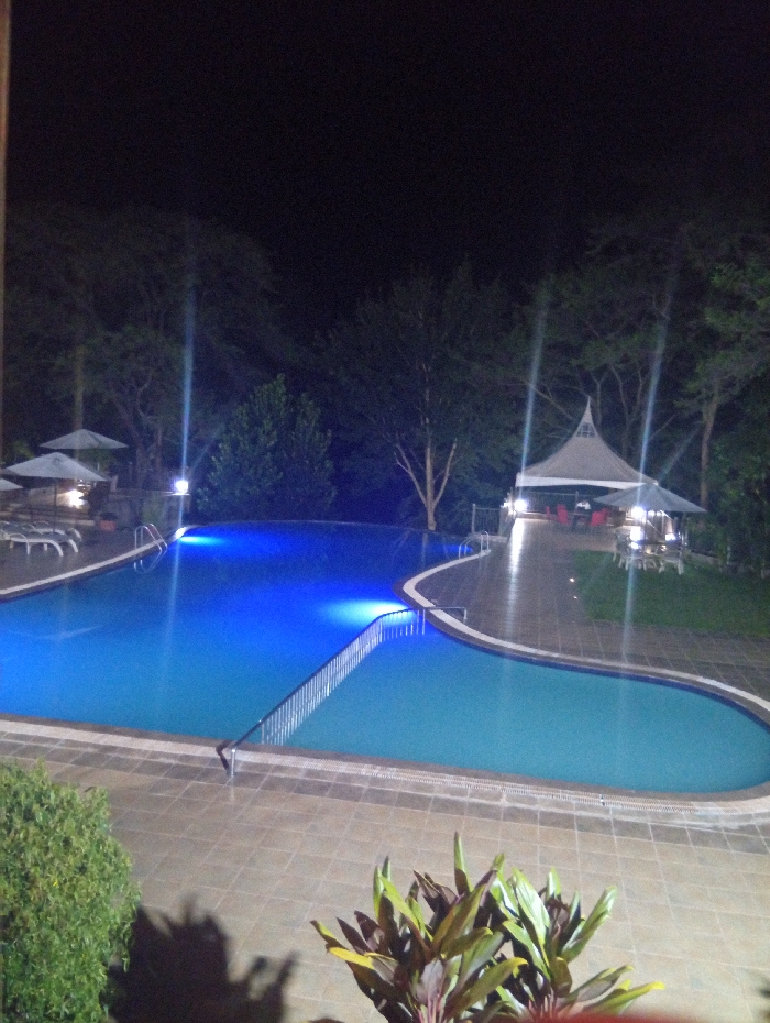 A nighttime view of a brightly lit swimming pool surrounded by tiled decking. Umbrellas and lounge chairs sit beside the pool on the left, while a gazebo with tables and chairs is on the right. The pool glows with blue light. Trees are visible in the dark background. In the foreground, there are plants with green and red leaves. The sky is dark.