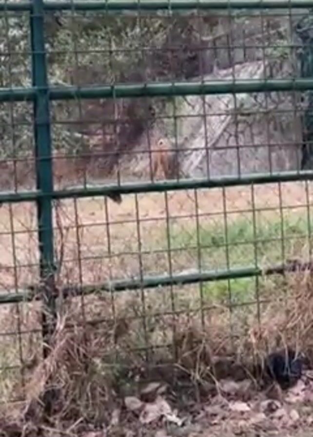 n animal in a zoo enclosure. The animal, which is tan colored, is visible through a green, chain-link fence. The enclosure has grass, some dead vegetation, a stone structure, and foliage. The animal appears to be walking slowly. The weather seems overcast.