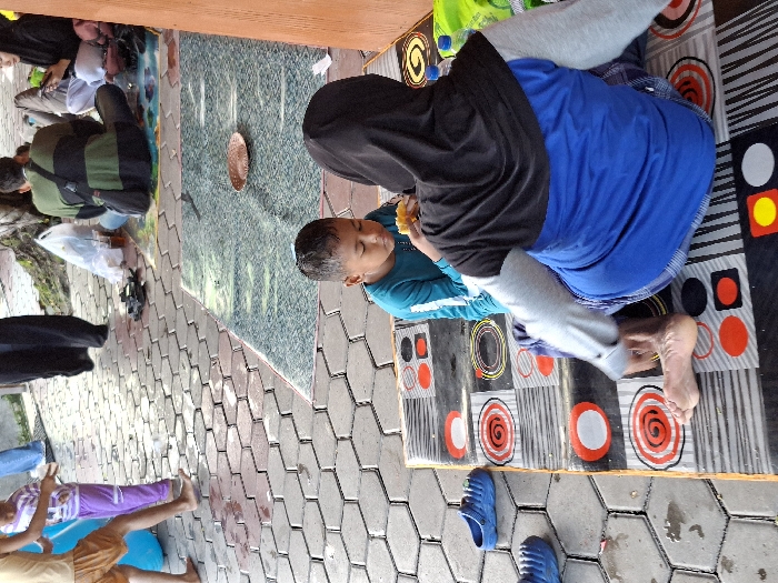 The scene is set on a paved area in Kecamatan Tulung, Indonesia, with a woman in a black headscarf seated on a black and white checkered mat, wearing a blue shirt