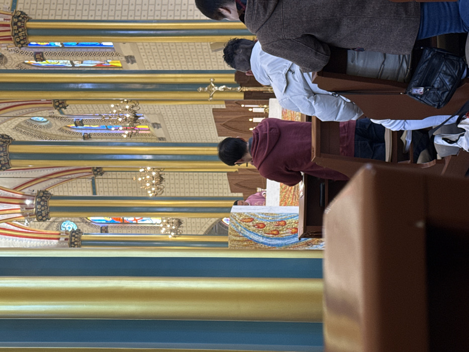 The image depicts the interior of a large religious edifice, identified as being located in Xicheng District, China. The scene focuses on the altar area and several congregants. The environment is characterized by high, vaulted ceilings supported by numerous ornate columns. These columns are distinct, featuring vertical sections alternating between teal-blue and gold, with decorative capitals. Above the columns, arched structures are visible with red and gold trim. The walls between the columns are light-colored, patterned with small, uniform squares or rectangles. Multiple large, multi-tiered chandeliers with lit bulbs hang from the ceiling. Stained-glass windows, displaying various colors and patterns, are visible in the upper sections of the walls, admitting ambient light. In the midground, towards the center-left, an altar area is visible. A person in a pink or purple vestment stands behind a white rectangular altar table. To the left of this person is a tall, vertical lectern or ambo featuring a mosaic-like design of a blue stream with multiple red, flame-like or teardrop shapes. To the right of the officiant, on the altar, two white candles are lit, and a crucifix depicting the figure of Christ is mounted on a dark wooden panel. In the foreground and midground, four individuals are visible from behind, kneeling or seated on kneelers in dark brown wooden pews. 1. The leftmost visible congregant (partially obscured) is wearing a dark top. 2. Adjacent to them, a person wears a dark red/maroon hooded sweatshirt and blue jeans. 3. To their right, another individual wears a white puffer jacket and light-colored trousers. Their dark hair is cut short on the sides. 4. The person furthest to the right is wearing a dark brown or charcoal-colored coat and blue jeans. A black quilted shoulder bag hangs from the back of the pew in front of this individual. Below the pews, a white and black umbrella and some papers are visible on the floor near the feet of the congregants. The individuals in the pews are oriented towards the altar, engaged in an act of prayer or contemplation. The officiant at the altar appears to be conducting a religious service.