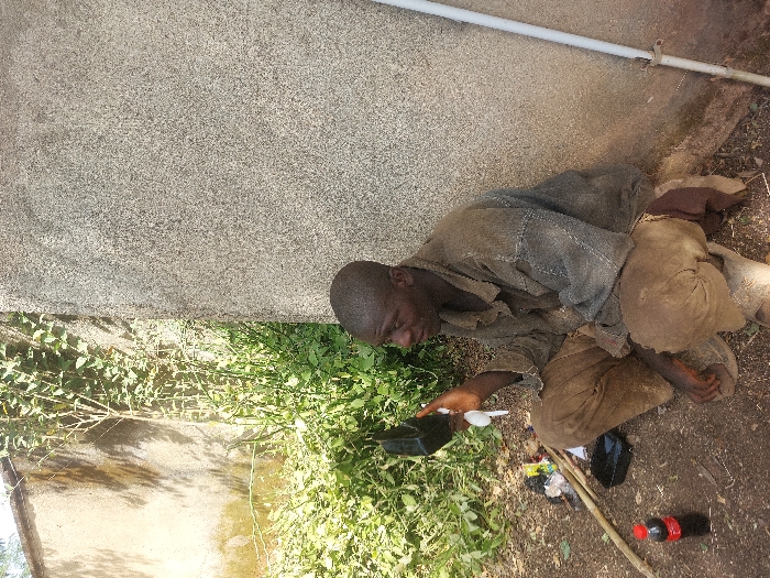 An adult male is observed squatting on reddish-brown dirt, leaning against a light grey concrete wall in Pankshin, Nigeria. He has dark skin and very short hair. He is dressed in a soiled, greyish-brown long-sleeved shirt and brown trousers, with worn open-toed sandals. In his left hand, he holds a black rectangular container, displaying a white plastic spoon. His head is turned to his left. On the ground to his left are a red Coca-Cola bottle, a second black rectangular container, scattered refuse including plastic items, and two wooden sticks. Behind him and to his left, dense green vegetation grows adjacent to another concrete wall. A white vertical pipe is affixed to the right-hand wall with a brown clip. The scene is illuminated by natural light.