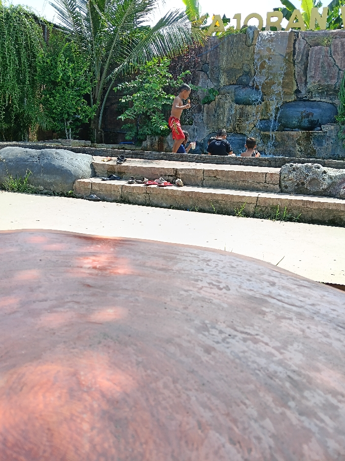 A partially visible round table dominates the foreground. In the background, a man in red shorts stands on stone steps next to a waterfall. Other people are visible around the waterfall, which flows from a stone structure bearing the word "KAJORAN." Lush green plants and trees surround the stone structure and waterfall, adding to the natural setting. Sandals are placed on the steps.