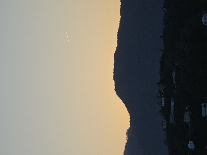 An image shows a mountainside at dusk, set against a gradient sky of pale yellow and light gray. A faint contrail streaks across the sky. The mountainside is dense with trees, giving way to visible structures on the lower slopes. The overall impression is of a tranquil, fading light over a natural landscape with hints of human presence.