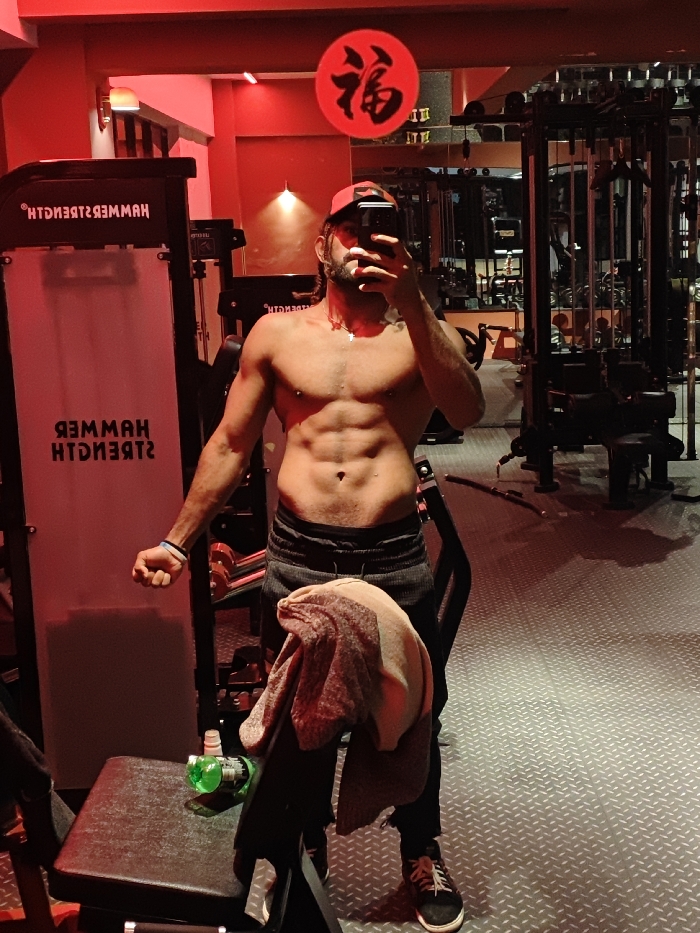 - "The image displays a shirtless male individual taking a mirror selfie within a gym characterized by dominant red ambient lighting, located in the Chongqing High-tech Zone, China" by FM-TY87o1, licensed under CC BY 4.0