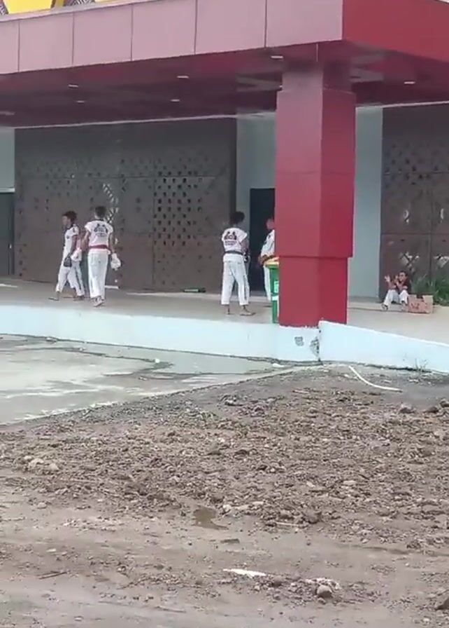 group of individuals practicing martial arts outdoors. They are wearing white uniforms with markings on the back, and appear to be performing choreographed movements. They are on a concrete platform in front of a building with a yellow and gray geometric design on the upper portion and a red-covered entryway below. There are red support pillars, a lattice-patterned screen on the back wall, and a doorway. A small motorcycle is parked nearby. The ground in front of the platform is dirt and gravel. A couple of other people are sitting in the background, observing.