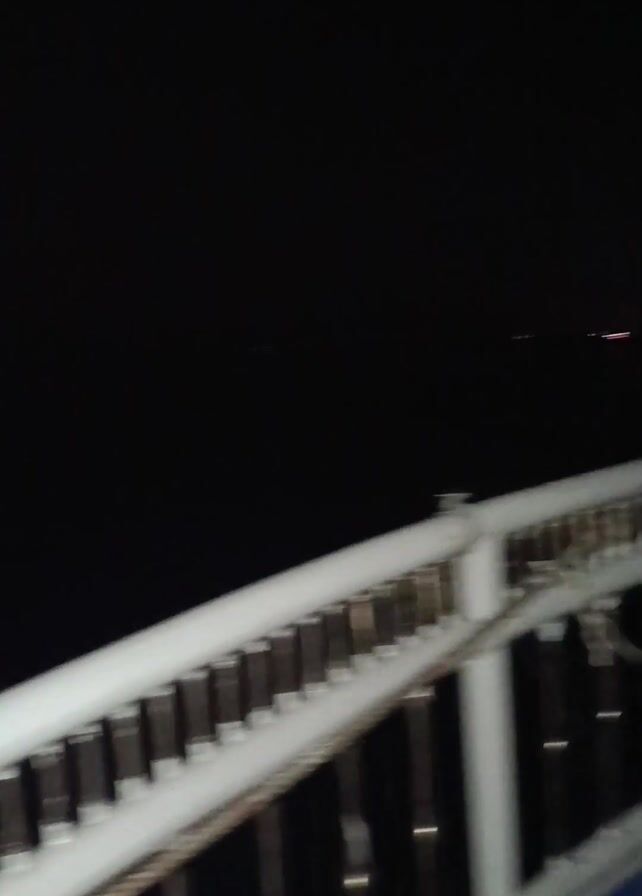 deck of a ship at night. The camera pans across the railing to show the dark water and faint lights on the horizon. It then moves to show the ship's structure, including a rope and some lit windows.