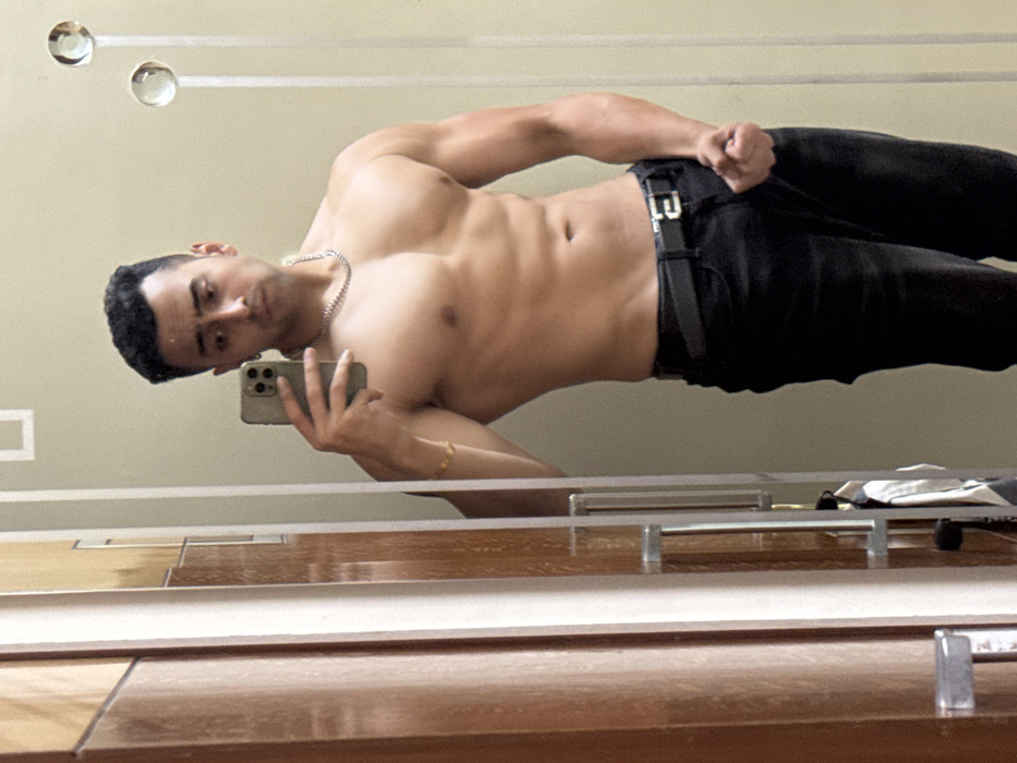 An indoor mirror selfie captures an adult male, appearing to be in his 20s or 30s, standing shirtless, showcasing a muscular physique with developed chest, shoulder, arm, and abdominal muscles