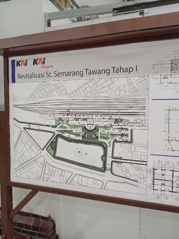 A large architectural plan, titled "Revitalisasi St. Semarang Tawang Tahap I" (Revitalization of Semarang Tawang Station Phase I) with the KAI Properti logo, is prominently displayed on a brown, wooden frame. The plan is an overhead view of the Semarang Tawang Station complex in Semarang, Indonesia, featuring multiple railway tracks, platforms, the main station building, and a substantial, roughly oval-shaped pond or lake surrounded by landscaped green areas directly in front of the station. Surrounding the station and the pond are depictions of urban infrastructure including roads and numerous block-like representations of buildings. Additional, more detailed architectural drawings, possibly floor plans or elevations, are visible on the right side of the main blueprint. The display frame stands indoors against a plain white wall. A section of a brick wall base is visible at the bottom left, and a metallic support structure with hints of green and yellow is visible overhead. No individuals or active interactions are present in the scene.