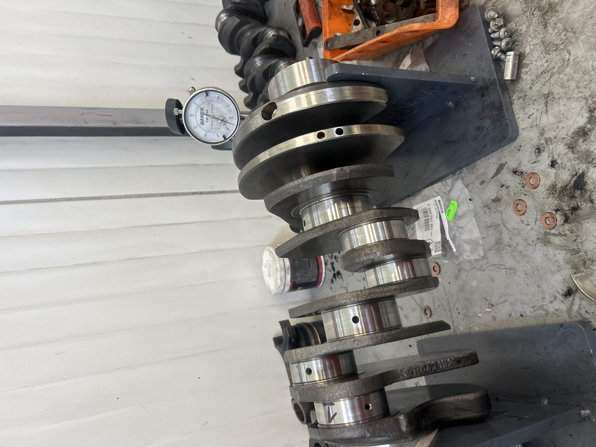 The image depicts an automotive crankshaft positioned horizontally on a dark gray metal support stand, undergoing inspection or preparation in Tsaratsovo, Bulgaria. A silver Hawek HW-176 dial indicator, measuring 0-10mm with 0.01mm precision, is mounted above one of the crankshaft's main journals on the right side. The crankshaft itself is a multi-lobed component with dark gray cast or forged sections and shiny, machined main and rod journals, some exhibiting internal oil passages. Several small, circular copper washers are scattered on the light gray, stained work surface in the foreground, alongside a pile of metal screws and a hexagonal socket. To the right, an orange plastic bin holds additional metal components. In the background, a white cylindrical container with a dark label and a clear plastic bag containing a Bosch item with a green tag are visible. Further in the background, multiple identical crankshafts are stacked or stored, and a portion of a connecting rod can be seen. The wall behind the setup is light-colored and vertically paneled, suggesting an indoor workshop or industrial environment.