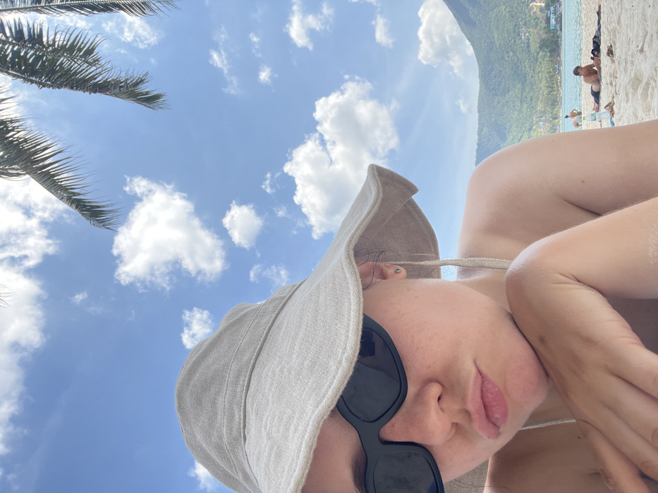 A person with fair skin is wearing a tan hat and black sunglasses, gazing upward towards a blue sky filled with puffy white clouds. The angle is tilted, showing a palm tree frond in the upper left corner. The background reveals a beach with turquoise water, green hills, and other individuals relaxing on the sand. The overall impression is one of leisure and sun-drenched tranquility.