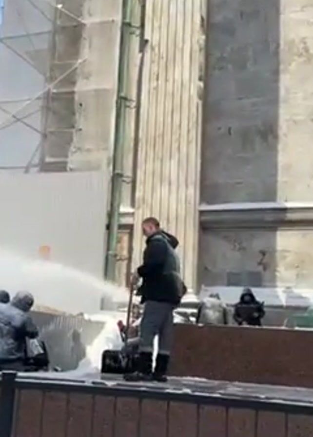 several workers removing snow from a large, old building's base. A man operates a snowblower, shooting snow to the side. Two people are sitting on the ledge of the building. The camera pans up to show tall, red columns with ornate tops, and a large window with a grid pattern. The building's façade has some scaffolding in place. A black fence runs along the bottom of the frame, with snow on the ground. It is a sunny day with a clear sky.