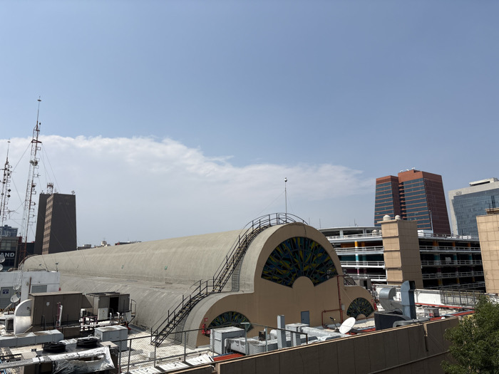 This is an elevated, wide-angle view of an urban environment in Mexico City, Mexico, captured during daylight hours under a largely clear blue sky with sparse white clouds. The dominant midground feature is the long, arched, light-colored concrete roof of the Mercado de San Juan Pugibet. One end of this roof terminates in a semi-circular facade featuring a large, colorful mosaic window primarily composed of green and yellow patterns. A black metal staircase with railings ascends the exterior of this arched structure. In the foreground and lower midground, various industrial rooftop elements are visible, including multiple HVAC units, vents, utility boxes, and a white satellite dish. A dark railing runs along the bottom right edge, indicating the vantage point. In the background, to the right, a multi-story parking garage is visible with a facade characterized by horizontal colored stripes in yellow, orange, blue, and green. Behind and to the right of the garage, two modern high-rise buildings stand out: one clad in reddish-brown panels with dark windows, and another taller structure with a reflective glass exterior. To the far left, a cluster of tall communication towers with multiple antennas rises atop a dark, rectangular building, with a partial sign displaying "LAND" visible on an adjacent structure below. No individuals or active movements are discernible within the scene.
