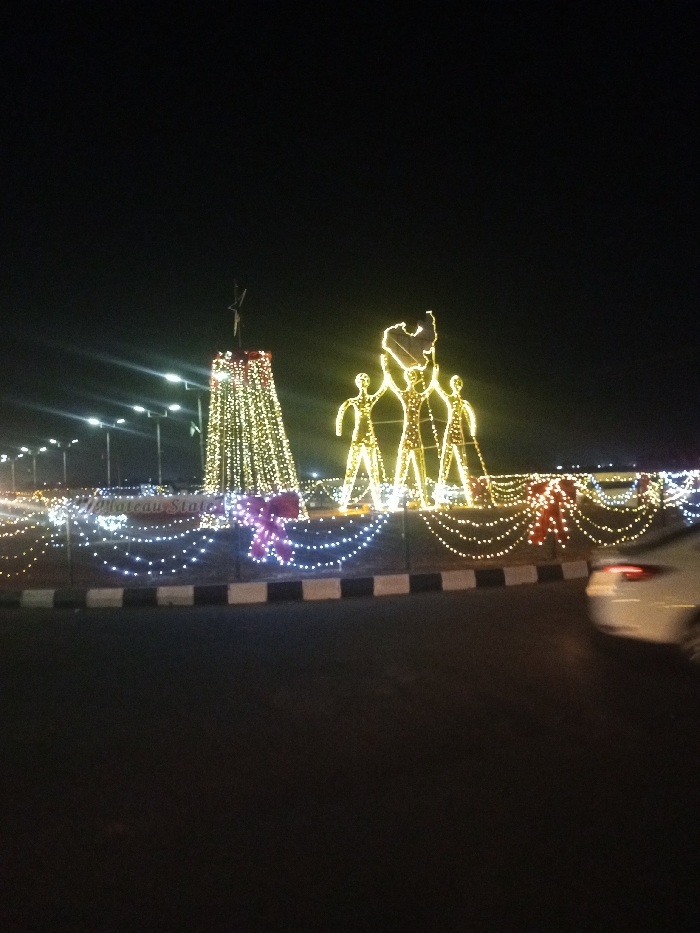 A roundabout at night is decorated with lights. A cone-shaped structure with a figure on top is draped in lights. Three figures holding an object aloft are illuminated with yellow lights. Strings of lights festoon the roundabout. A car is visible at the roundabout's edge. The background is dark and a row of streetlights is visible further back.