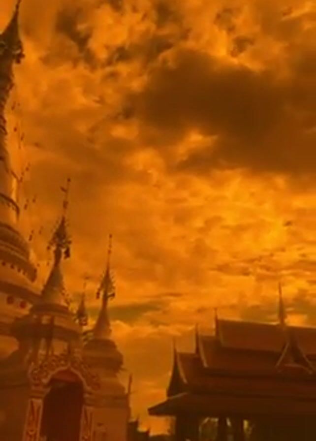 Buddhist temple, likely in Southeast Asia, under an orange-colored sky with clouds