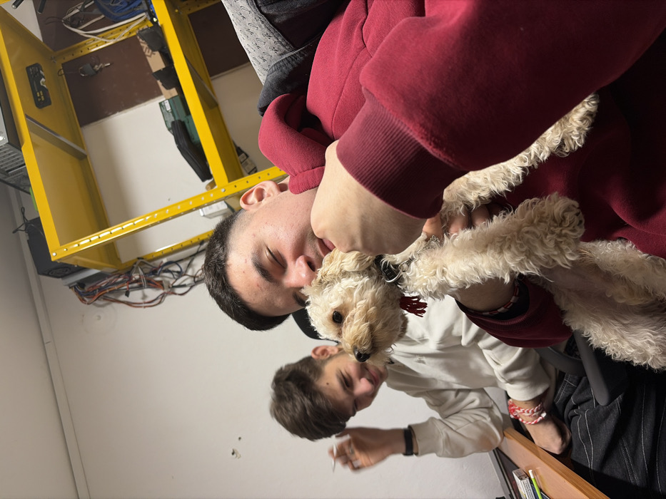 An indoor scene in Plovdiv, Bulgaria, features two young adult males and a small, light-colored, curly-haired dog