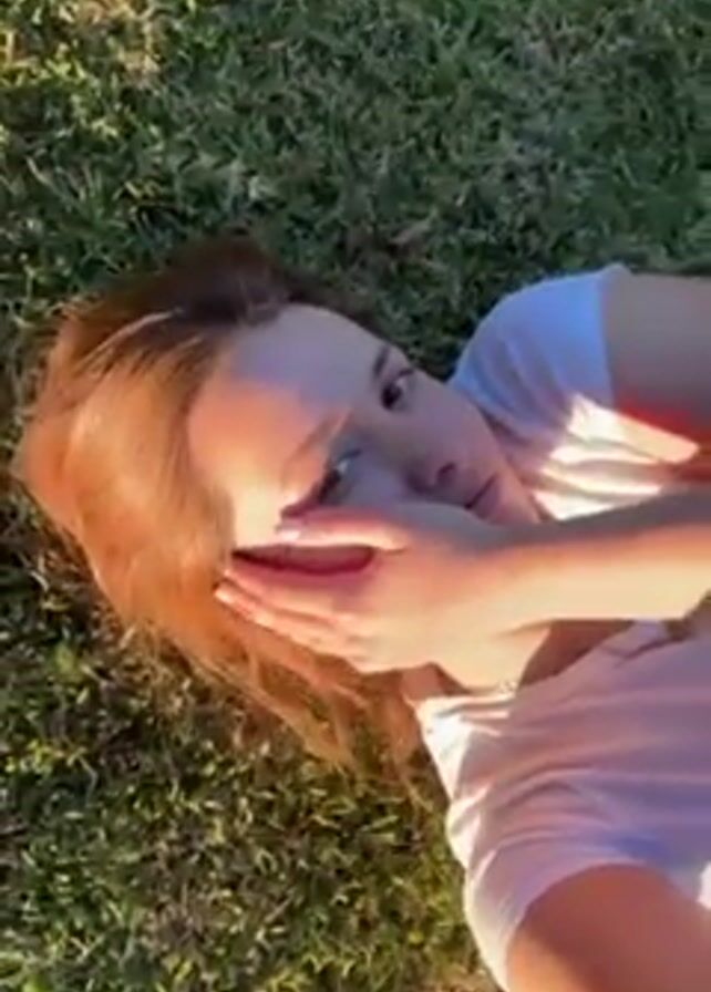 A woman lies on her back on a lawn of green grass. She is wearing a white t-shirt. She has light brown hair and pale skin. She shields one eye with her hand. The light is bright and sunny, causing a flare in the camera.