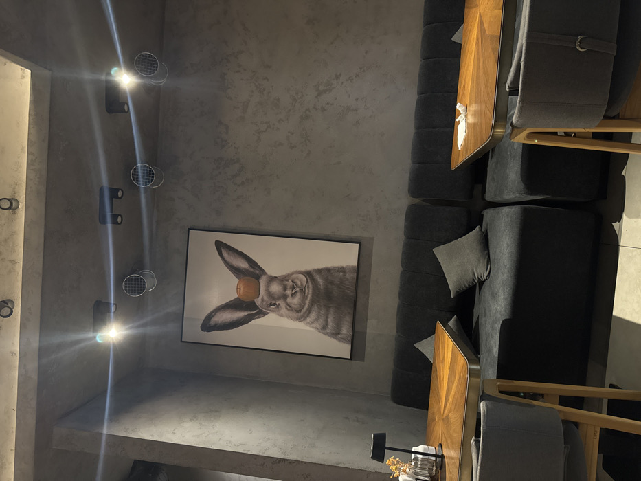 The image depicts the interior of a commercial establishment, specifically a cafe or restaurant, located in Chișinău, Moldova. The walls and ceiling are rendered in a uniform textured grey finish. A large, vertical framed print dominates the left wall, showcasing a realistic depiction of a grey rabbit with a small orange apple balanced on its head. Beneath the artwork and extending across the frame are dark grey upholstered booth seats composed of modular sections, each featuring a backrest and seat cushion. Several small, square grey throw pillows are distributed on the booths. Two wooden tables with distinctive patterned tops and metal edges are positioned in the foreground. The table on the left supports a black-shaded table lamp, a small glass vase containing dried floral elements, and a set of condiment shakers. The table on the right contains crumpled white paper or napkins. Parts of two grey upholstered dining chairs with light wooden frames are visible at the tables. The ceiling features a track lighting system with multiple black, adjustable light fixtures, several of which are active and produce visible lens flares. Two cylindrical silver-colored ventilation grilles are also mounted on the ceiling. The floor appears to be a light-colored tile. No individuals are present in the scene.