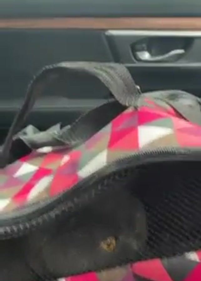 interior of a car moving through a snowy landscape. A pet carrier sits on the seat, and an animal with yellowish eyes can be seen through the mesh. The window shows snow-covered trees and a roadside covered with snow. The car interior has black leather seats and wood trim.